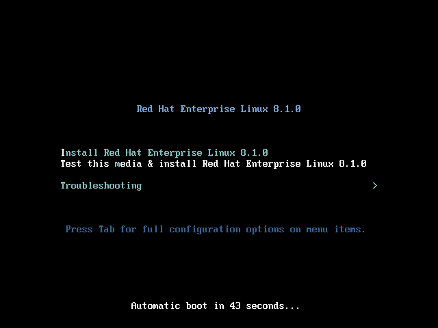 - 鼠标点击进入,用键盘选择【Install Red Hat Enterprise Linux 8.0.0】,等待界面加载完成