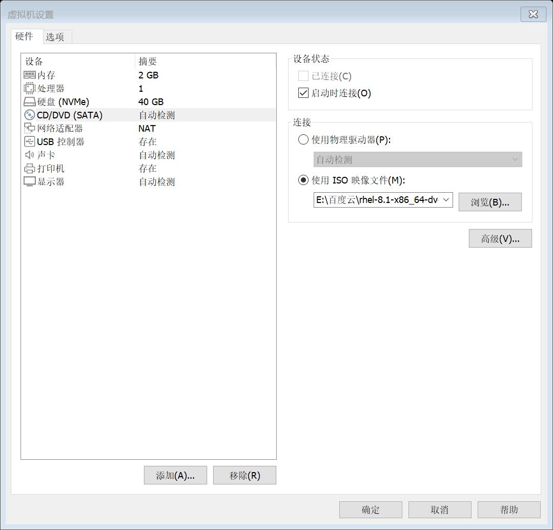 - 点击图中的【CD/DVD】,设置光盘文件(⚠在开启虚拟机前设置好,否则打开虚拟机检测不到操作系统!)