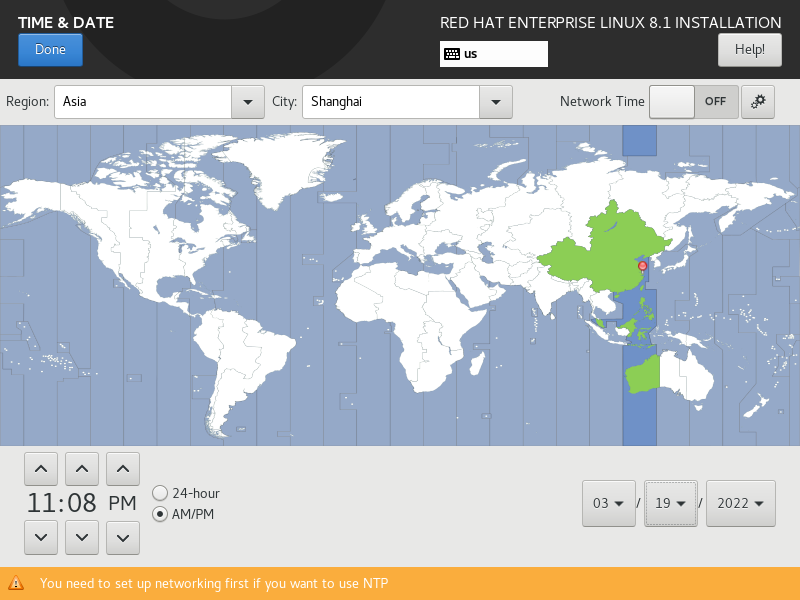 - 【键盘】和【语言支持】看个人喜好修改,建议英文。选择【Time & Date】,修改时区为【Shanghai(上海)】并设置好时间,点击【Done】
