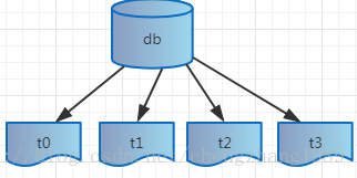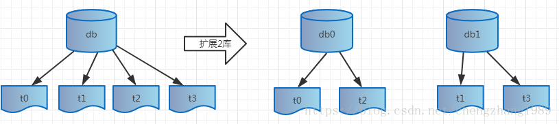 假设id=0,1,2,3,因为我们只有一个库,所以id=0应该落在t0表中,id=1落在t1表中,id=2落在t2表中,id=3落在t3表中,现在我么要扩展到两个库,按照上面的取余表,id=0还是落在原来的库(标记为db0),id=1应该落在新增的库(db1) 中,id=2落在原来的db0中,id=3落在db1中,相当于是要把原来库中的t1和t3表整表搬迁到db1中,扩展后如下图所示: