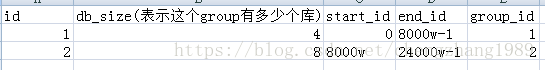 c,结合按范围拆分以及hash取模两种形式的优点,我们想到了一种拆分方式,看个例子:假设我们规划的单库容量是2000w条数据,我们按照group进行划分,第一次划分的时候预计容纳8000w条的数据,所以我们得有4个库,后面我们再次进行扩展到可以容纳24000w条数据,所以此时需要增加8个库,我们把这8个库归属到另一个group,所以会有下面的数据来记录这个对应关系: