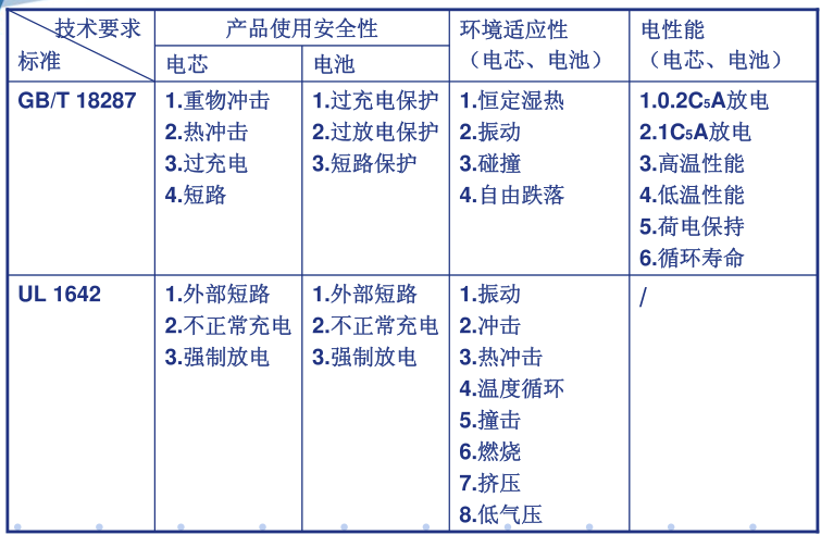 - UL 1642是美国UL于1985年10月首版推出的针对锂电芯安全的规范标准,是国际上最为广泛认证的评估锂电芯在遭受各种故障情况下电池安全可靠性的权威标准。 主要针对电芯(cell)。 UL 1642的主要测试项目包括室温短路测试,55度短路测试,过充测试,挤压测试,重物冲击测试,机械冲击测试,振动测试,热箱测试,温度冲击测试,高空模拟测试,弹射测试等。