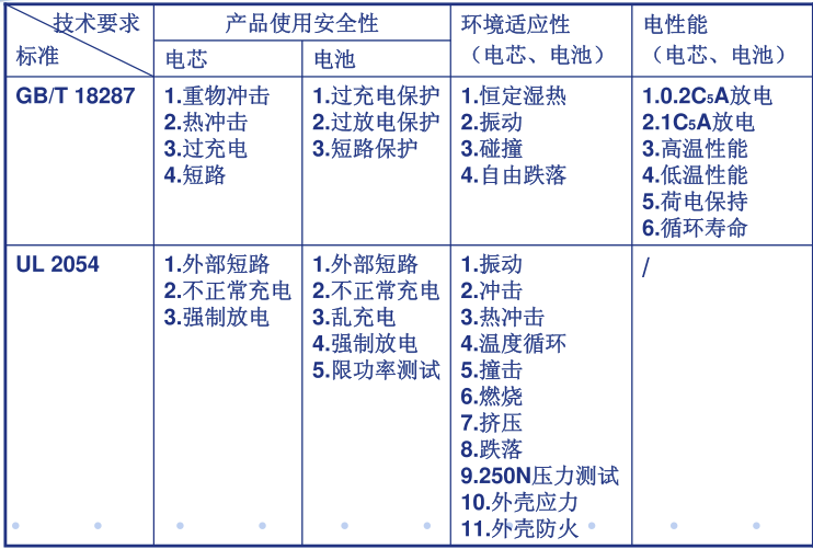 - UL2054则主要针对锂电池组或者说锂电池包(battery pack)。适用于产品中用作电源的一次(不可充)和二次(可充)的电池。这些电池可由单个电化学电池或两个或者更多个通过化学反应把化学能转化为电能的锂离子电池并联或串联组成。UL2054的测试项目主要包括电测试( 短路测试 、过充测试 、滥用过充测试 、过放测试、限功率源测试)、机械测试(挤压测试、冲撞测试、加速度测试、振动测试)电池组外壳测试、跌落撞击测试、250N静力测试、模具压释放测试、火烤测试、抛射测试、环境测试、高温测试、温度循环测试等。