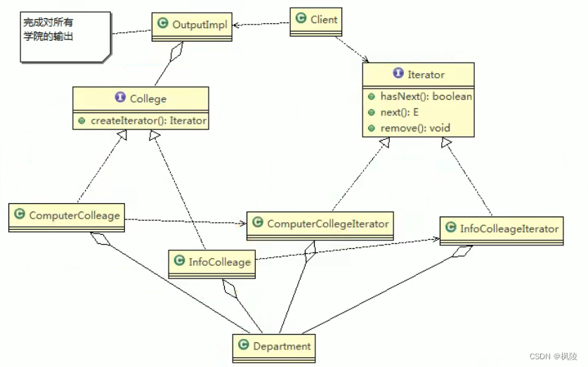 public class OutPutImpl {//学院集合private List<College> collegeList;public OutPutImpl(List<College> collegeList) {this.collegeList = collegeList;}//遍历所有学院,然后调用printDepartment 输出各个学院的系public void printCollege(){Iterator<College> iterator = collegeList.iterator();while (iterator.hasNext()){College college = iterator.next();System.out.println("====="+college.getName()+"=======");printDepartment(college.createIterator());}}//输出系public void printDepartment(Iterator iterator){while (iterator.hasNext()){Department next = (Department) iterator.next();System.out.println(next.getName());}}