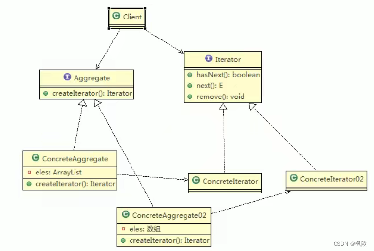 Client: 客户端,通过Iterator和Aggregate依赖子类