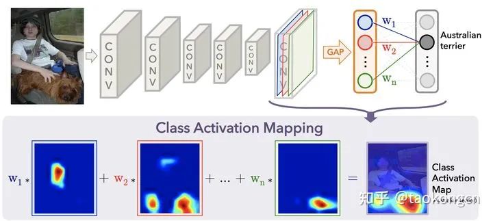 对你没有看错,图像关注的部分就是将该类的fc层中的权重和feature maps对应加权求和就行了。。。说实话我觉得这个真的是经过很多实验才发现的idea。因此通过这个CAM我们便可知这个网络到底在学什么东西。