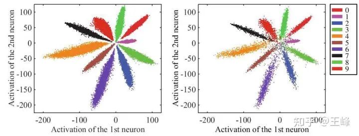 有了这个可视化手段,人们发现原来softmax loss训练出来的特征是这样一个放射型分布,类与类之间是按角度分隔开的,于是才有了后续一系列工作关于角度的分析。