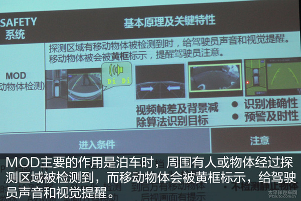 MOD全称为Moving Object Detection,中文“移动物体检测”。主要的作用是泊车时,周围有人或物体经过探测区域被检测到给驾驶员声音和视觉提醒。