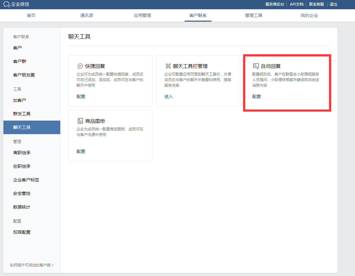 您在PC端以管理员登录企业微信后,在后台管理页面,点击“客户联系” -“工具”-“聊天工具”-“自动回复”-“配置”,管理员可设置自动回复的规则和内容。