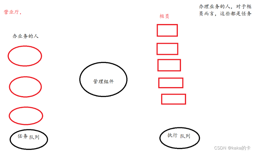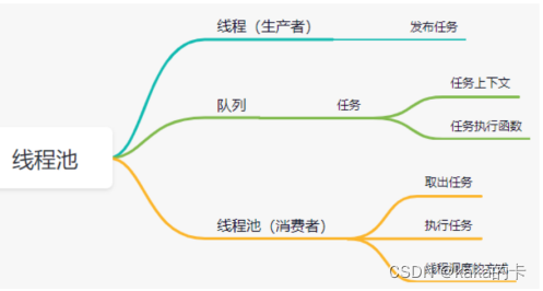 分别为任务队列(生产者)、工作队列(消费者)、管理组件(互斥锁和条件变量)。