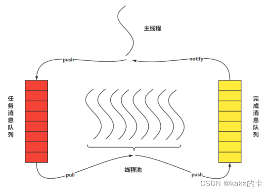 条件变量:用来维护多线程之间的同步关系,当任务队列为空时要求线程释放互斥锁并在条件变量下等待,这时任务队列中每插入一个任务就唤醒一个线程。