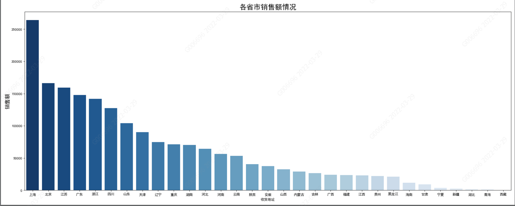 - 销售额最高的省市是上海,北京、江苏、广东、浙江为第二梯队