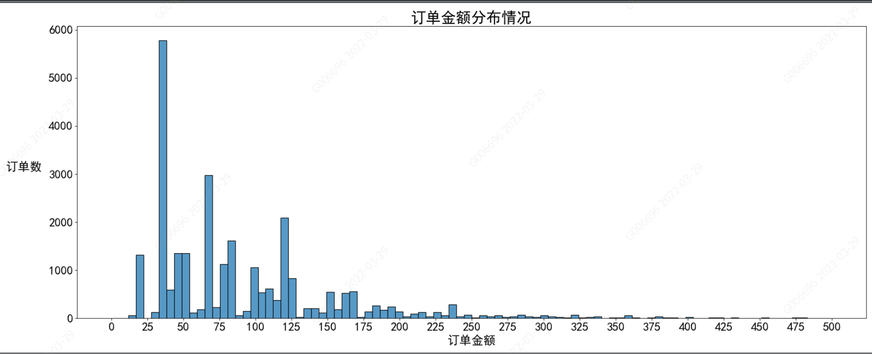 - 大部分订单订单金额在200元以下,尤其是20-125元