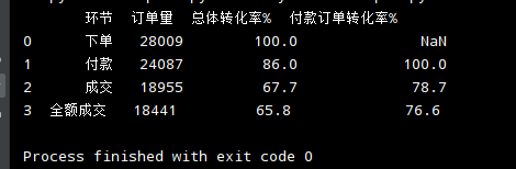 data_funnel['总体转化率%'] = np.round(data_funnel['订单量'] / data_funnel['订单量'][0], 3) * 100