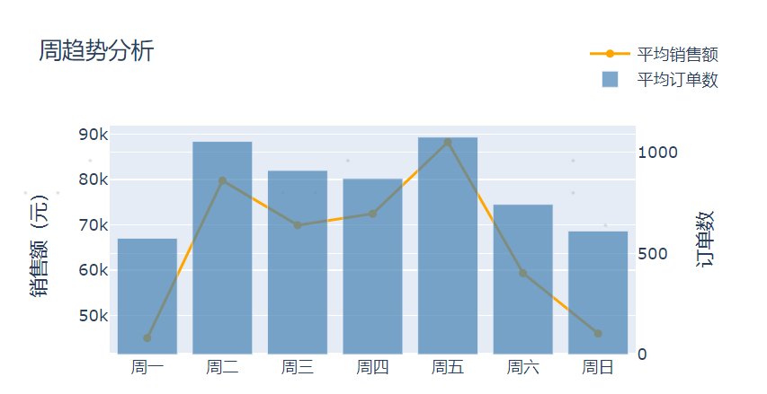 - 每周销售最好的是周五,其次是周二,最差的是周一