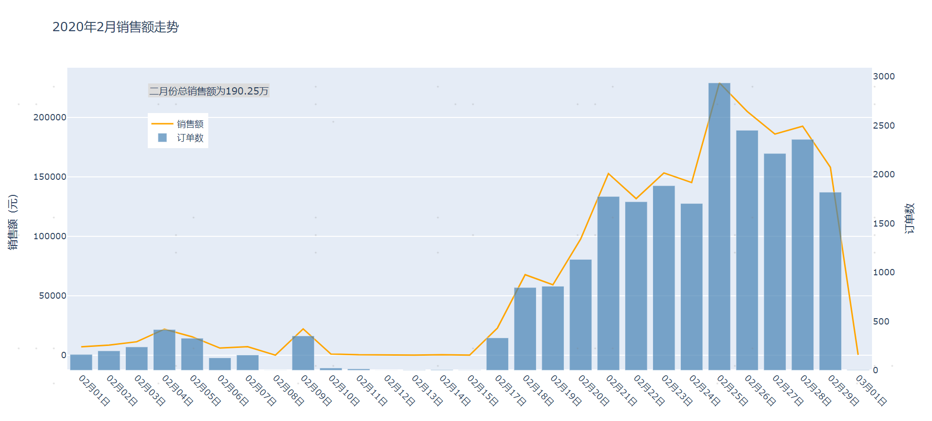 - 2月总销售额为190.25万元,由于过年快递停运和疫情原因,销售量不是很乐观