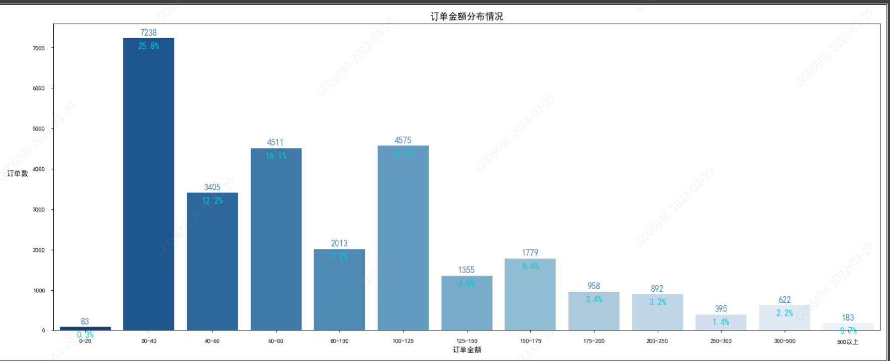 - 其中20-40元的订单量最大,占了总订单量的1/4