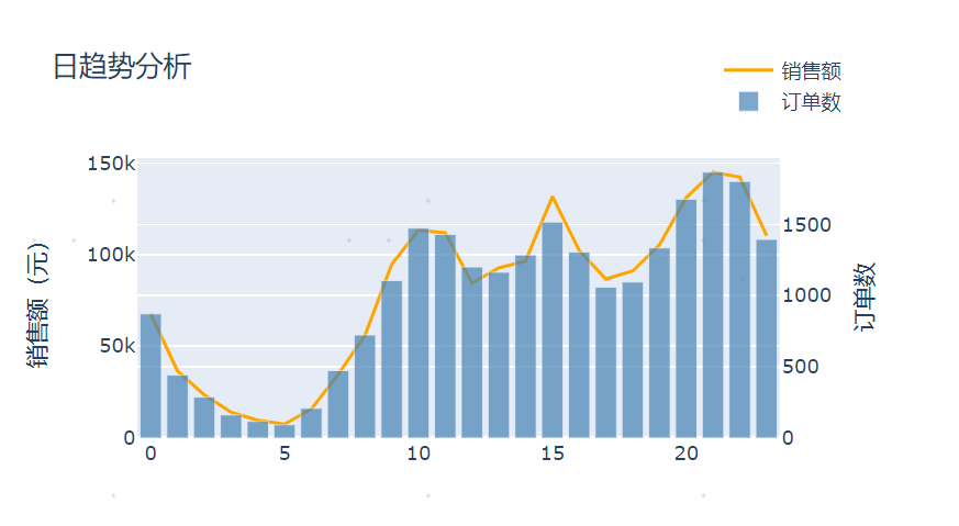 - 凌晨销量最低,从6点开始销量稳定提升,中午开始趋于稳定略有波动,在10时 15时 21时分别有一个高峰,22点后销量开始下滑