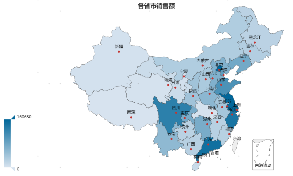 map.set_global_opts(title_opts=opts.TitleOpts(title='各省市销售额', pos_left='center'),visualmap_opts=opts.VisualMapOpts(min_=0, max_=data_desc['总金额'].max() * 10,range_color=['#D7E3EF', '#006699']),legend_opts=opts.LegendOpts(is_show=False))