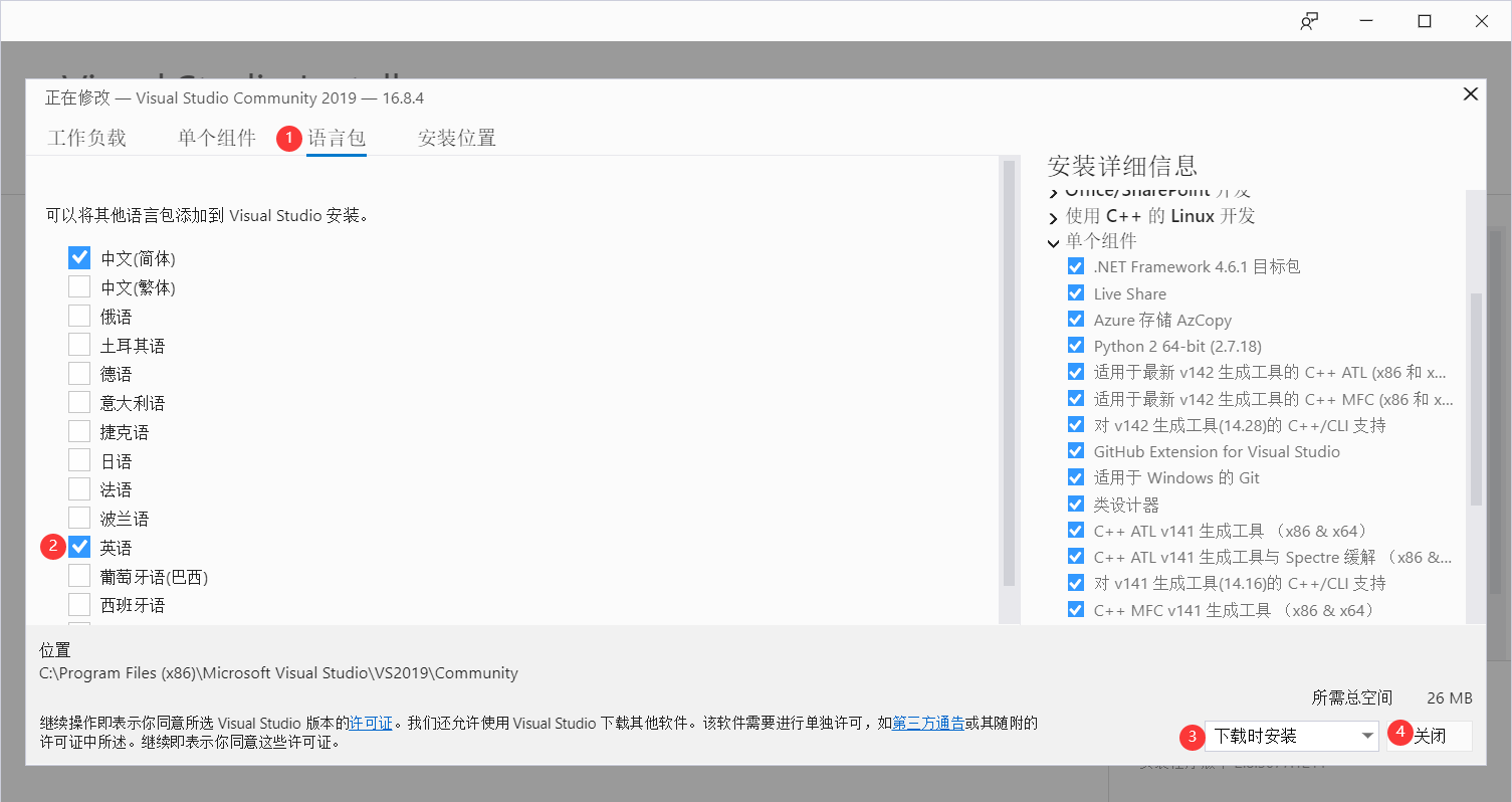 在Windows中文版操作系统下,Visual Studio可能默认安装为中文版,并不带英文语言包。如果Viusal Studio没有应用英文语言包,很多三方库很容易编译失败,因此首先需要给Visual Studio安装英文语言包。