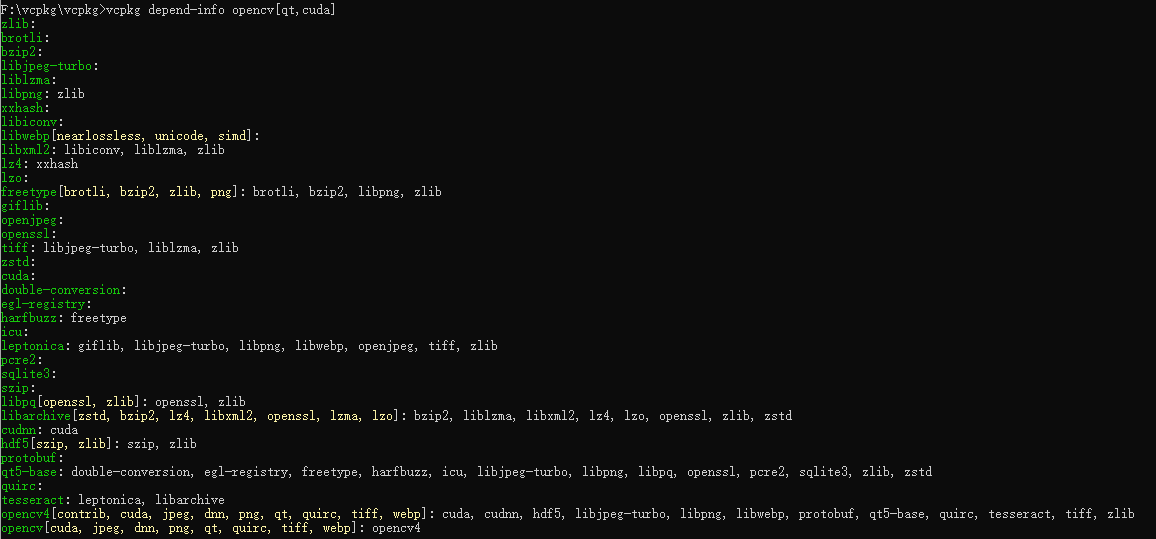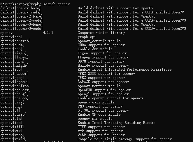 需要注意的是,通常一个软件包可以附带多种其他三方库的功能支持,部分功能已经被vcpkg支持(可以通过 s e a r c h search search命令查看软件包附带的第三方支持),通过vcpkg安装软件包时也可以同时制定三方库特性的支持。例如安装一个Windows系统64位版本的带