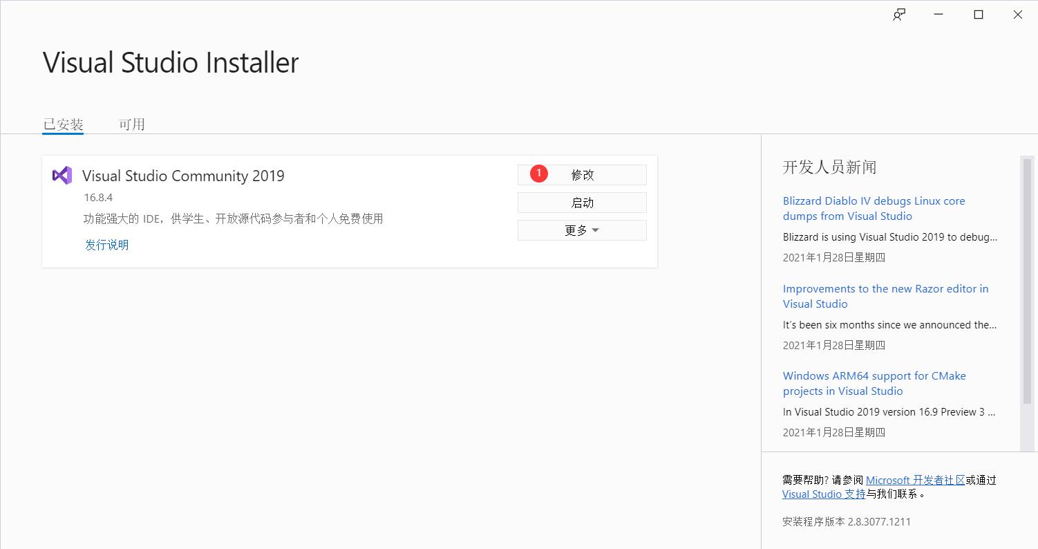 ,在对应版本的Viusal Studio选项卡右方点击修改