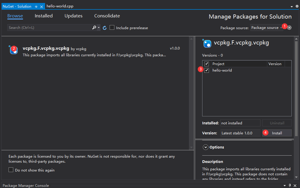 安装一个指定的软件包,该C++软件包必须被vcpkg支持,即在