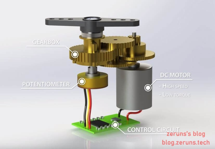 舵机的内部结构如上图所示。你可以看到控制电路,马达,一组减速齿轮和外壳。