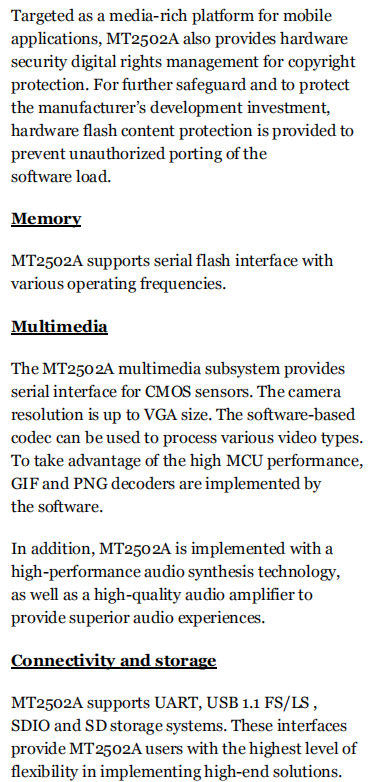 内存:4MB(MT2502A、MT2502D)、8MB(MT2502C)