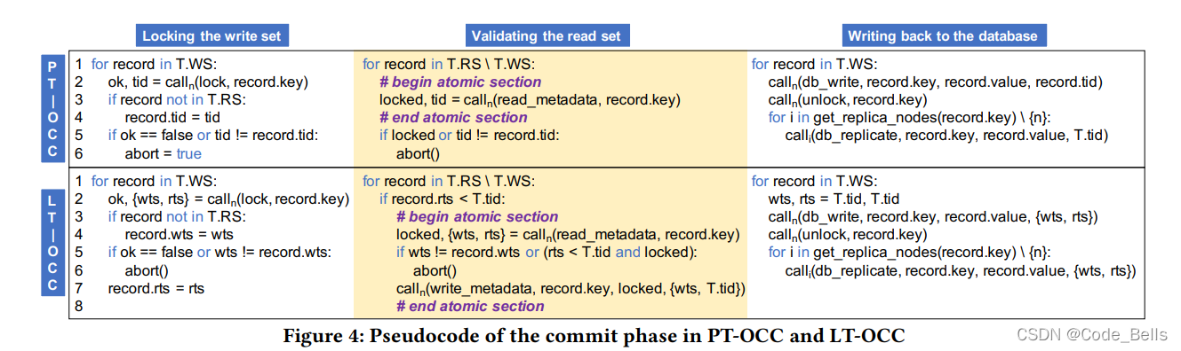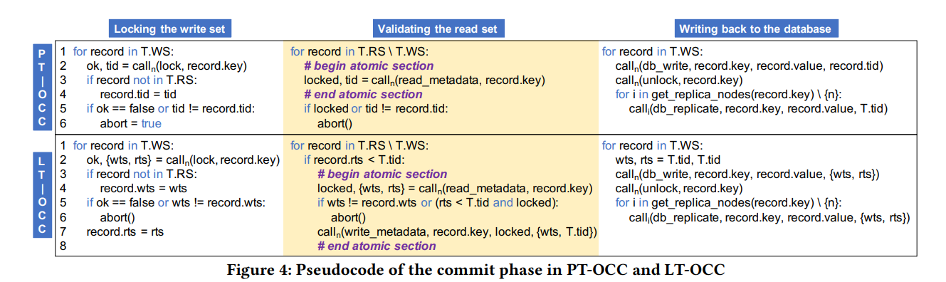 大部分和PT-OCC相同。wts是记录写的时间,也相当于之前physical time的TID,rts是可以读取的时间,因为在当前时间有读写集,所以rts需要更新到最新的时间。