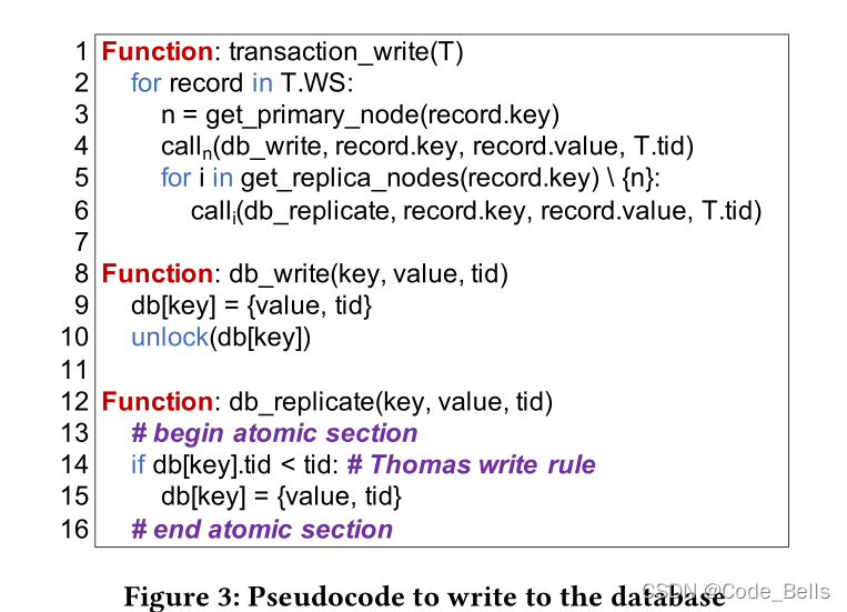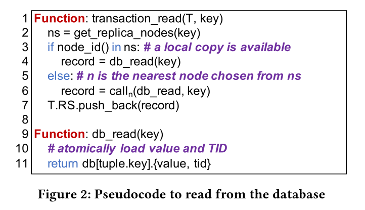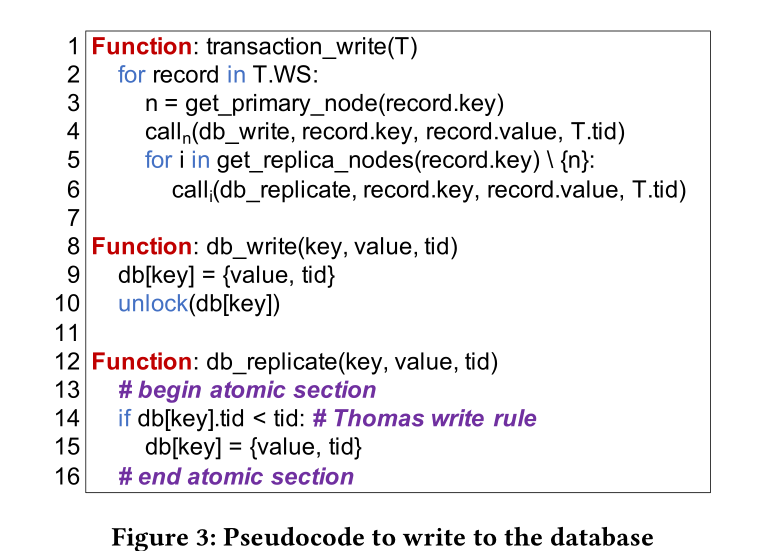 写集上锁后进行OCC验证,也就是对比TID的过程。只有OCC验证通过才能进行提交,否则就abort。下面就是写入数据库的过程,得到所有key的副本节点(第3行),然后找一个最近的节点写入该数据(第4行),再对所有节点进行同步(第5-6行),因为异步同步的原因,不能保证多个事务写的顺序一致,所以采用了托马斯写规则,写TID更大的那个,直接覆盖前一个(第14-15行)。
