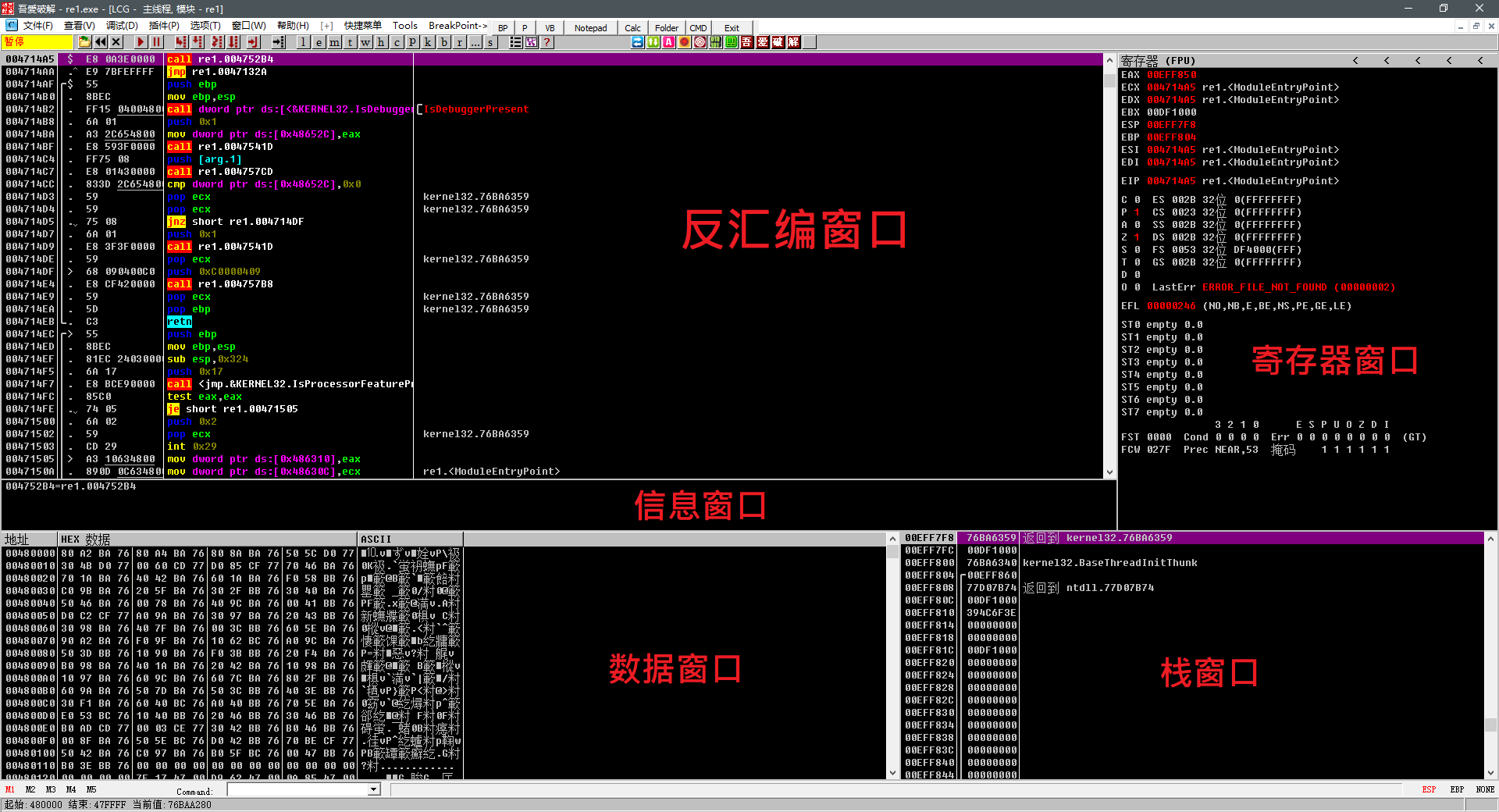 我们用OD打开程序,会看到下面的这个样子,如果没接触过OD的人可能直接被劝退了,这是啥乱七八糟的,别急,一点点来看,打开程序后会出现5个面板(我更喜欢称之为窗口),分别是反汇编窗口,信息窗口,寄存器窗口,数据窗口,栈窗口。