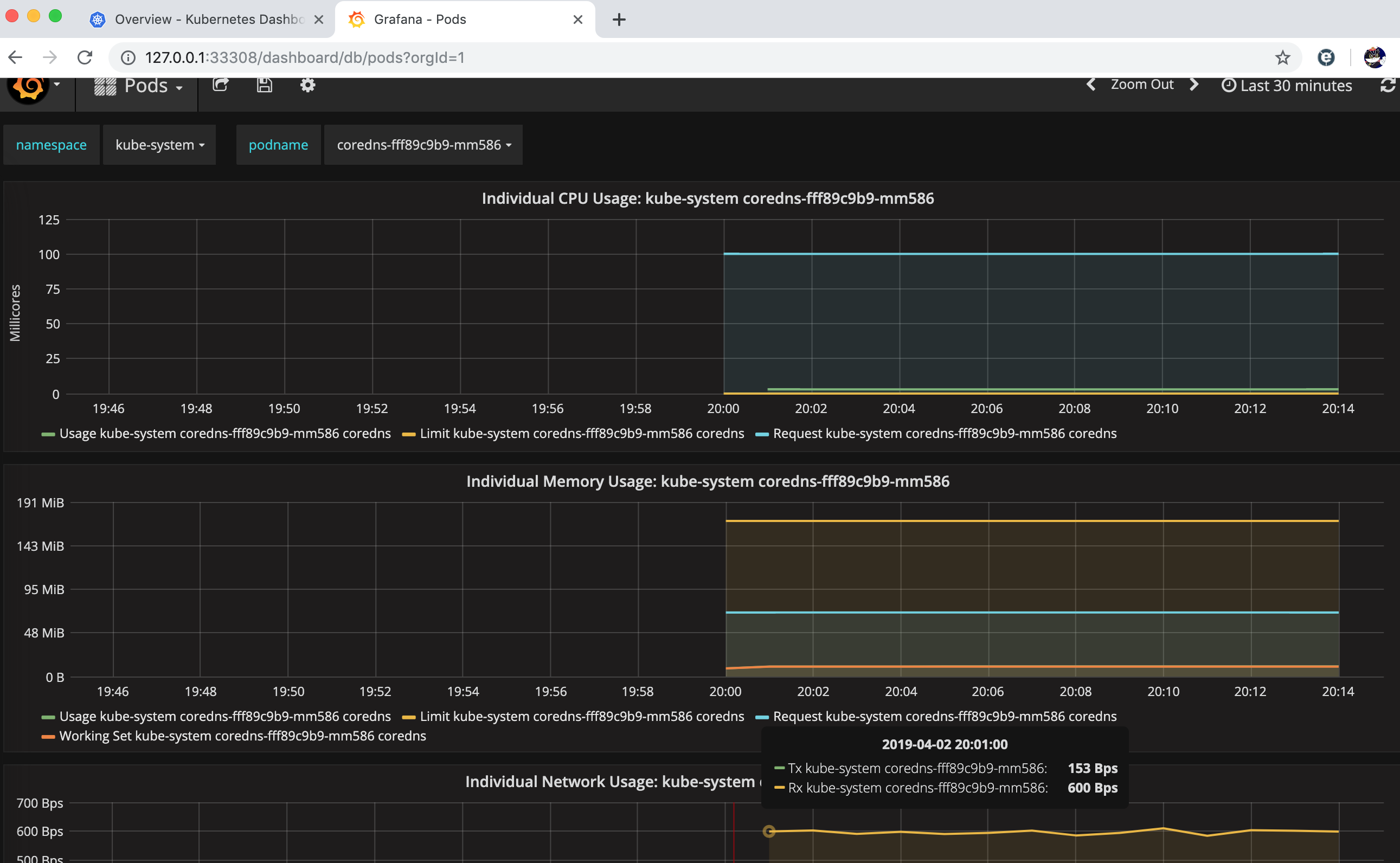可以选择cluster或者pod的状况,这里确认kube-system的namespace下的coredns的pod相关的资源信息,如下所示。