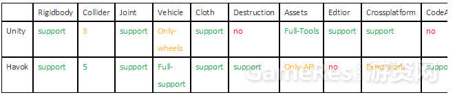 Unity和Havok主要物理功能对比