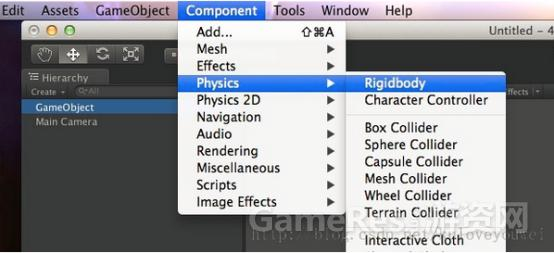 Unity3D通过其提供的各种Component访问PhysX的物理功能,打开菜单栏中的Component->Physics便可以看到各种组件: