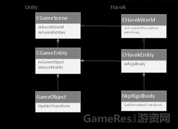 如果我们以CGameScene封装了UnityScene,CGameEntity封装了游戏逻辑对象,CHavokWorld封装了物理世界,CHavokEntity封装了物理功能对象,那么,以一个刚体碰撞对象为例,他们之间的对应关系应该是: