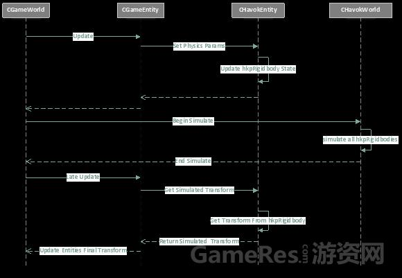 简单描述上图中,一个刚体对象的整个功能流程是:CGameWorld中的CGameEntity在一系列逻辑更新之后,准备好了一系列的物理更新参数(可能是需要改变的额外力大小,或者是需要改变的质量大小);然后CGameEntity将这些参数设置给物理对象CHavokEntity,CHavokEntity将参数分解,交给具体的实现对象(hkpRigidbody刚体实现对象);当所有的CGameEntity都传递好参数之后,CGameWorld通知CHavokWorld,开始模拟;等模拟结束之后,所有的CGameEntity再纷纷从CHavokEntity中获取模拟的结果(由hkpRigidbody维护的位置,朝向等最终模拟结果),而这些模拟结果,最终会被设置给GameObject的Transform,拿去做下一步的逻辑处理或者直接渲染。
