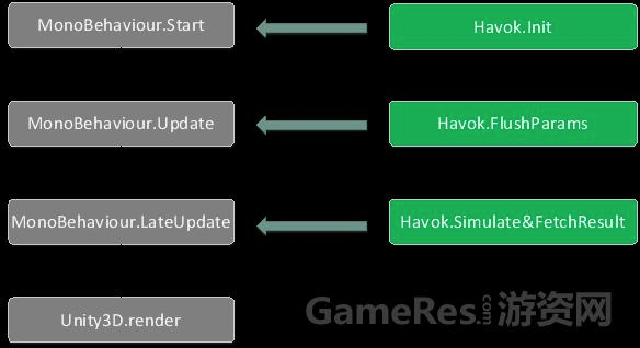 由于Unity3D依然负责整个游戏的主更新流程,那么便需要将Havok的更新整合入Unity3D的流程中。一个比较合理的更新流程应该是逻辑对象先更新,然后将物理参数传入物理引擎,逻辑对象更新完成之后,物理引擎开始进行物理模拟,物理引擎返回模拟结果,Unity3D使用模拟结果进行渲染。
