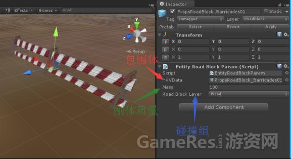 如图,物理描述脚本EntityRoadBlockParam中包含了路障对象的包围体,质量,碰撞组等物理信息。这种形式的结合方案的不足之处在于,每一个Scene都必须包含Havok引擎完整的更新流程控制代码,无法做到像Unity3D原生物理引擎那样直接拖拽组件就能看到效果。