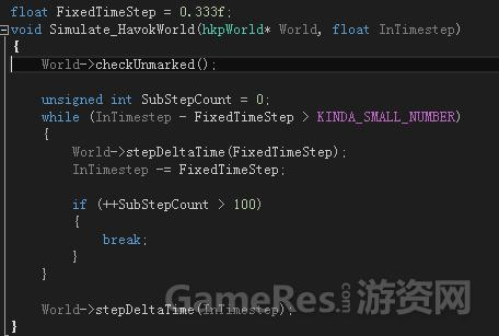 Havok物理引擎在模拟过程中需要一个稳定的更新间隔时间,如果这个间隔时而长时而短,会导致模拟不稳定,发生穿透,位置跳变等现象。解决的办法是,一旦发现间隔时间过长,则在过长的间隔时间之内,以固定的频率多模拟几次,我们称为稳定模拟模式。