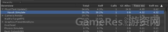 从分析结果上可以看出,在离散模式下,Havok和PhysX的模拟消耗差不多;但是在连续模式(4)下,PhysX的数据有点离谱,PhysX的连续模拟模式在手机上完全无法使用,而Havok则有高出离散模式一倍的开销。