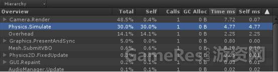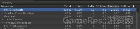 在场景中堆置168个Block,以一定的间隔时间给每一个Block施加一个随机力,用来扰动这些Block,使他们相互碰撞,观察模拟耗时,在Sansung Note4(3) 手机上,分析结果如下: