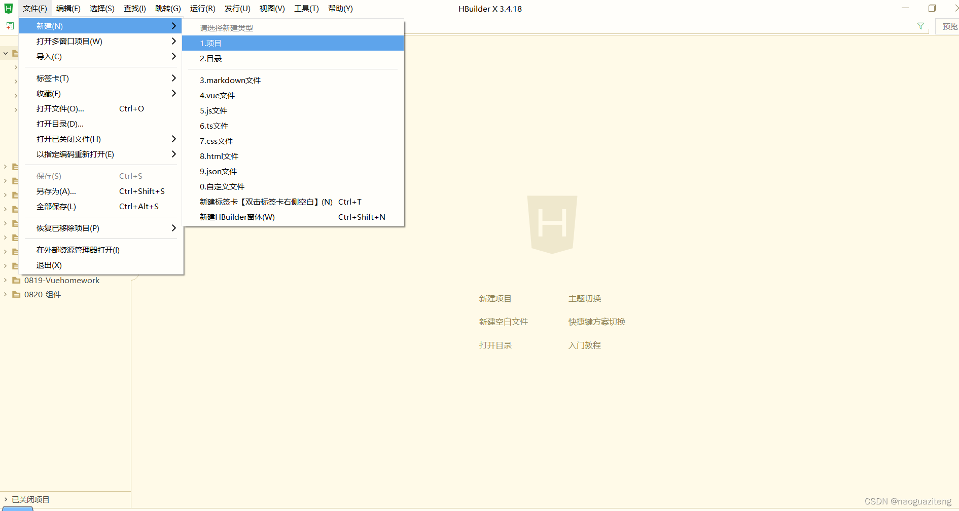 文件 ---> 新建 ---> 项目(或者点击中间区域的新建项目)