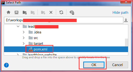 找到要加入的项目的pom文件,选中pom文件后点击 OK 按钮,就加入了。