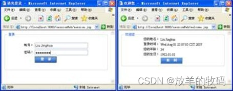 登录界面验证用户登录信息,如果登录正确,就把用户信息以及登录时间保存进Session,然后转到欢迎页面welcome.jsp。welcome.jsp中从Session中获取信息,并将用户资料显示出来。