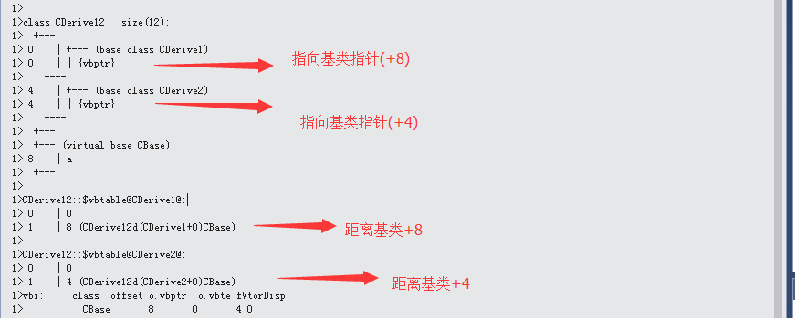 对于派生类CDerived1和CDerived2,不论是其内部实现,还是实例化的对象,基类CBase是否是它们的虚基类是没有影响的。受到影响的是它们的派生类CDerived12,因为它从两条路径都能到达CBase。