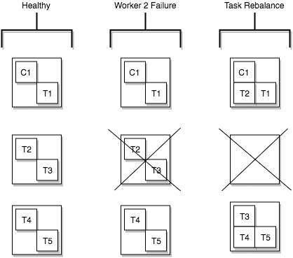 任务故障转移示例显示了在工作器故障时任务如何重新平衡。