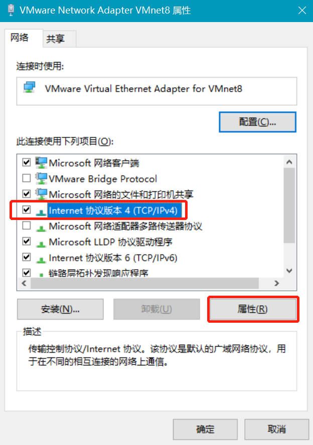 右击VMnet8,选择属性,跳出属性编辑窗口,选择IPV4后点击属性: