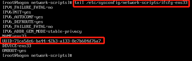 上图通过ip addr指令我们看到了两条信息,分别时lo和ens33,那么系统中就存在ifcfg-ens33这个文件,输入下图指令查看对应内容,就能找到我们需要的UUID: