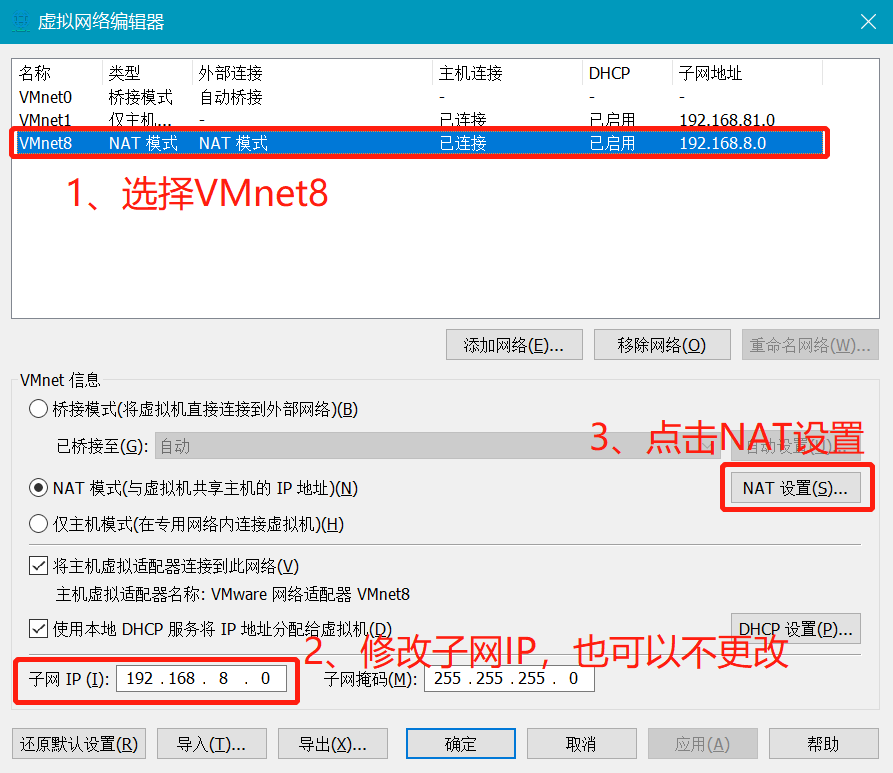 在宿主机(实际使用的计算机)上使用xshell等工具连接虚拟机上的linux时,总会因为IP地址的变动而不停的修改xshell等工具的连接,为了避免这些麻烦,将虚拟机上的Linux的IP地址设置成为固定IP成了我们的最佳选择。
